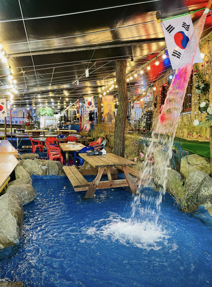 실내에서도 발을 담그고 먹을 수 있으며 실내에 인조폭포가 있어