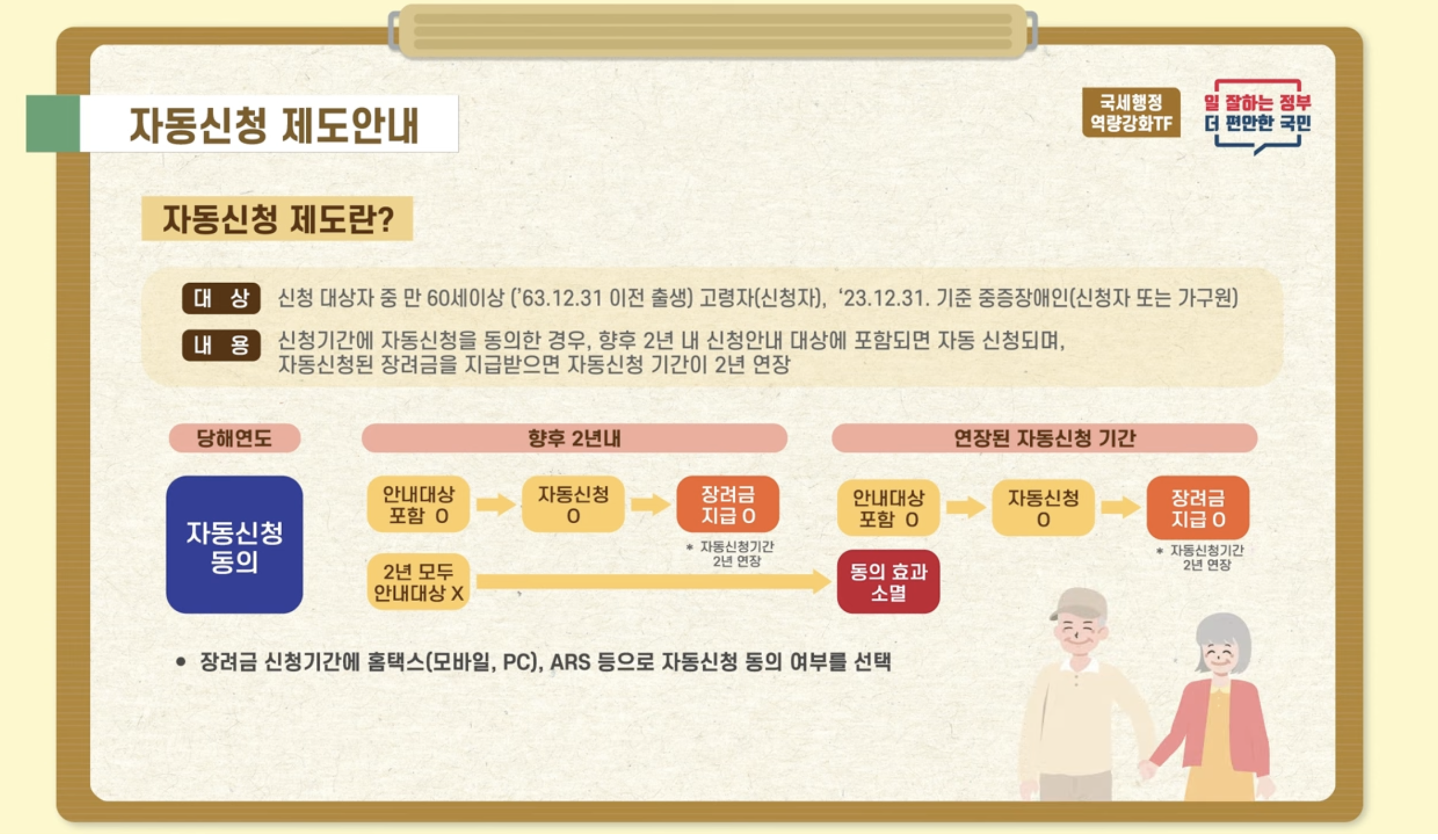 60 세 이상 고령자 및 중증장애인이 장려금 신청기간에 동의하면 향후 2년 내 안내대상 포함 시 자동신청가능 합니다.