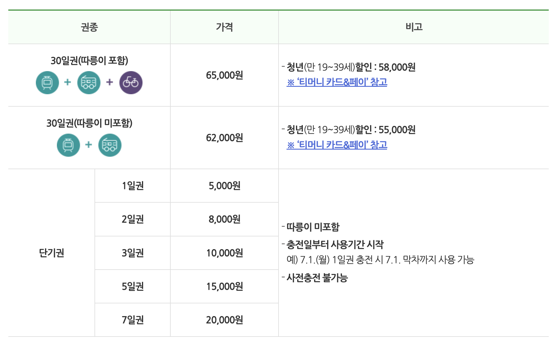 지하철+버스 62,000원 / 지하철+버스+따릉이 65,000원으로 선택할 수 있으며
