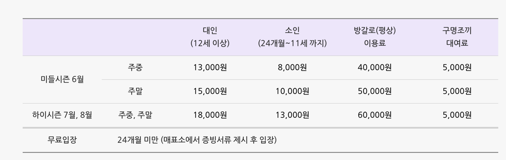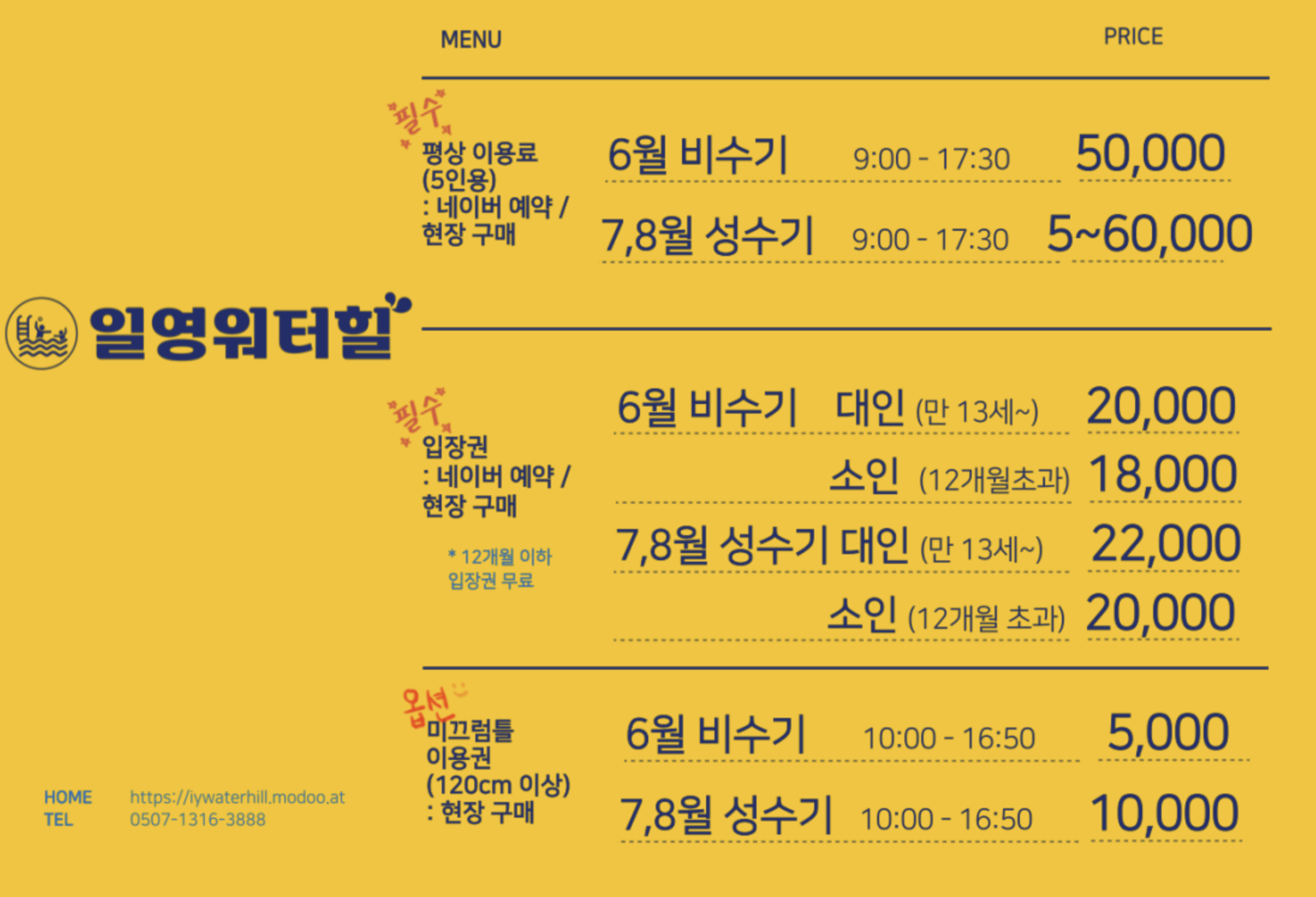 자세한 안내사항은 아래 일영워터힐 홈페이지에서 가격 및 이용수칙 확인하실 수 있습니다.