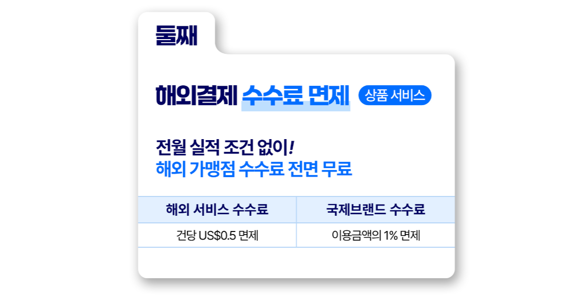 해외 서비스 수수료는 건당 0.5달러, 국제브랜드 수수료는 이용금액의 1%를 면제 해줍니다.