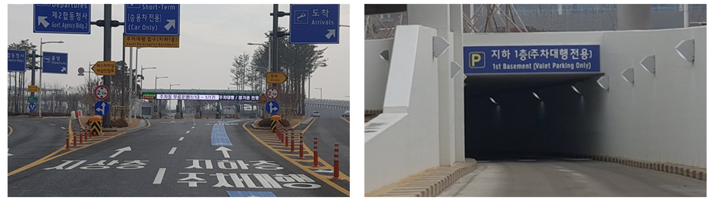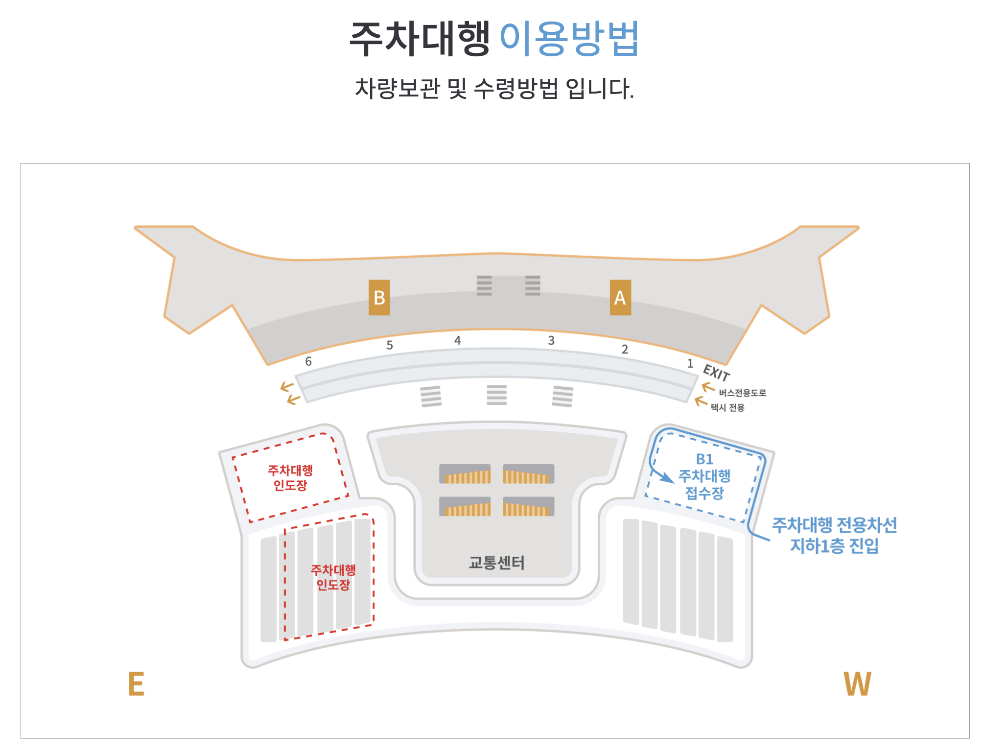 차량을 맡기실 때에는 터미널 진입 시 주차대행 전용차선으로 진입하시면 됩니다.