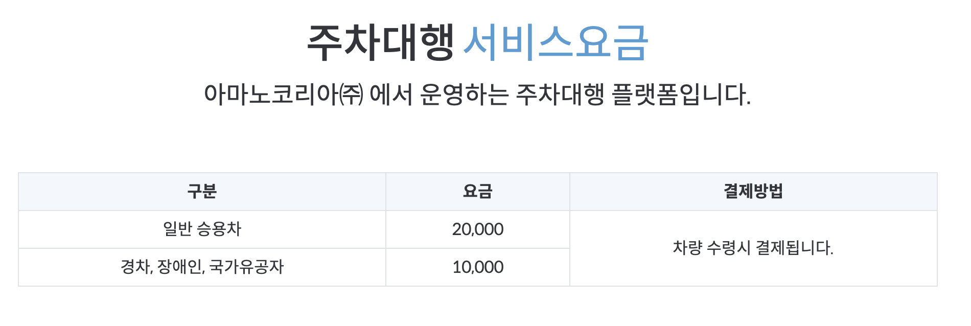 주차대행 발렛비용의 금액이며 제휴 카드가 있을 시 무료로 이용 가능합니다.
