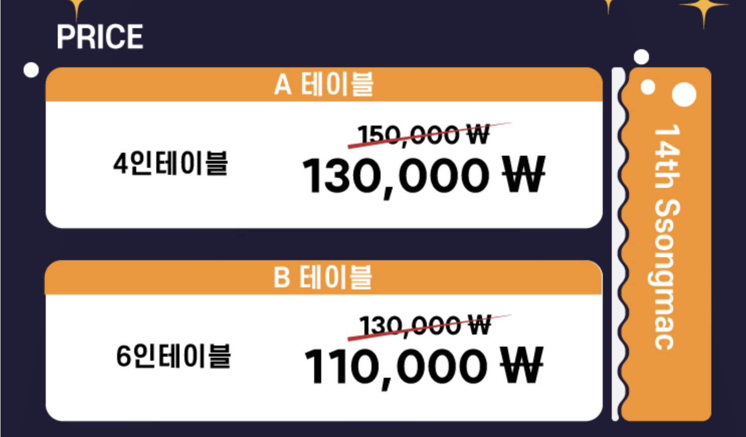 🔵 가격 : 4인테이블 130,000원 / 6일테이블 110,000원
