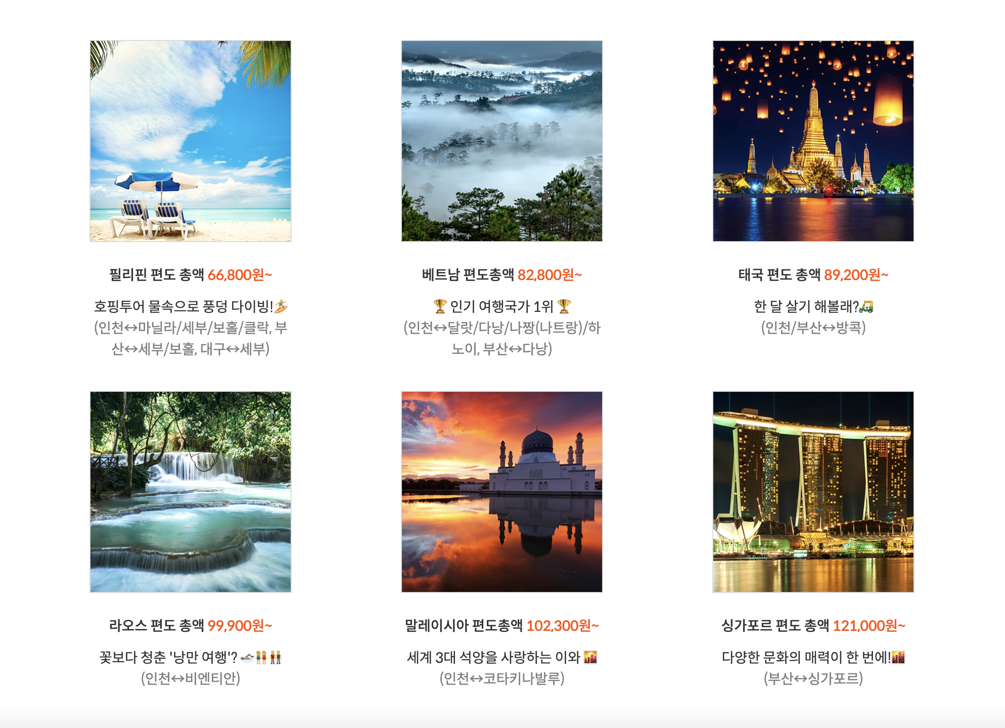 라오스 99,900원~ / 말레이시아 102,300원~ / 싱가포르 121,000원~