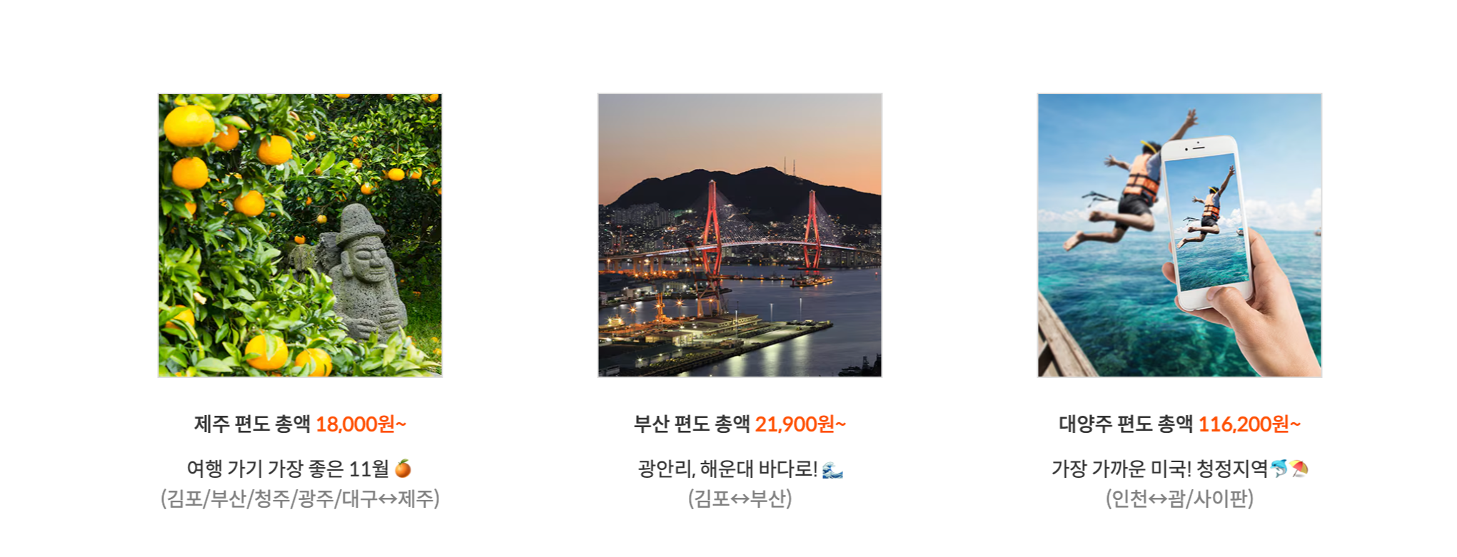 제주 18,000원~ / 부산 21,900원~ / 대양주 116,200원~