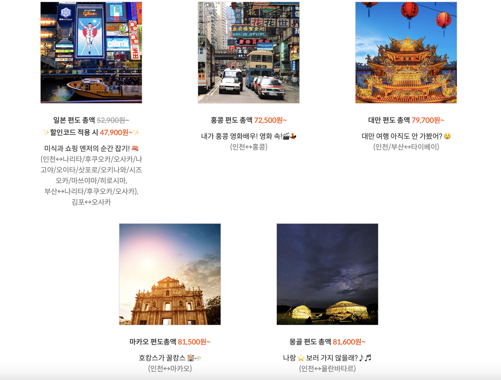 일본 47,900원~ / 홍콩 72,500원~ / 대만79,700원~