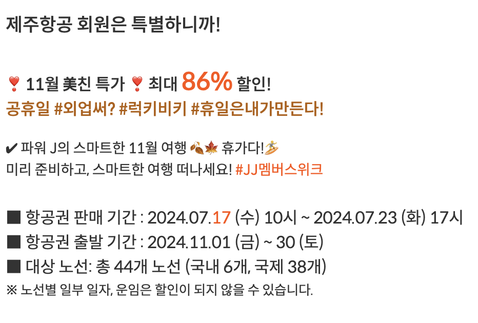 항공권 특가는 제주항공 회원들에게만 제공되며 올해 11월에 이용할 수 있습니다.