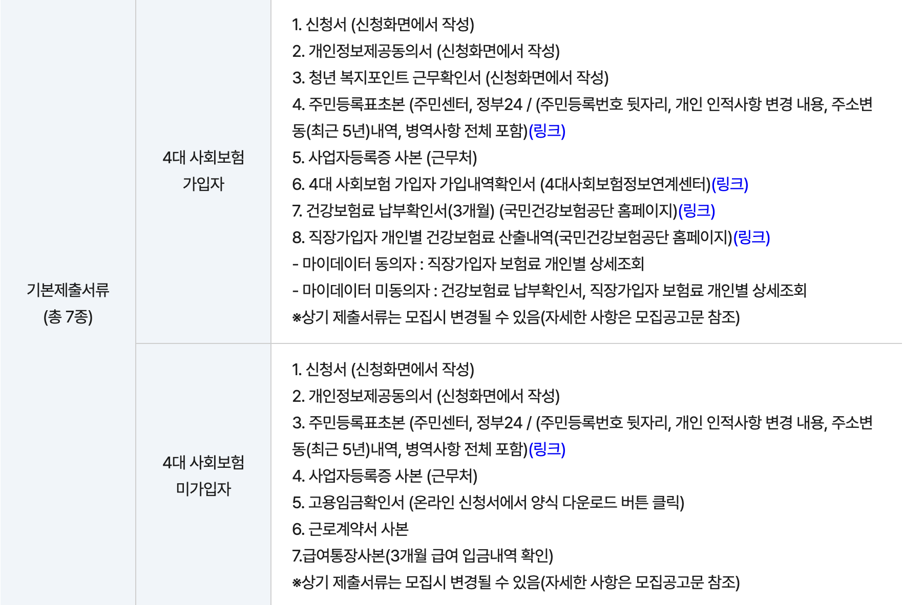 신청시 제출할 서류가 있는데 4대보험 가입여부에 따라 달라집니다.