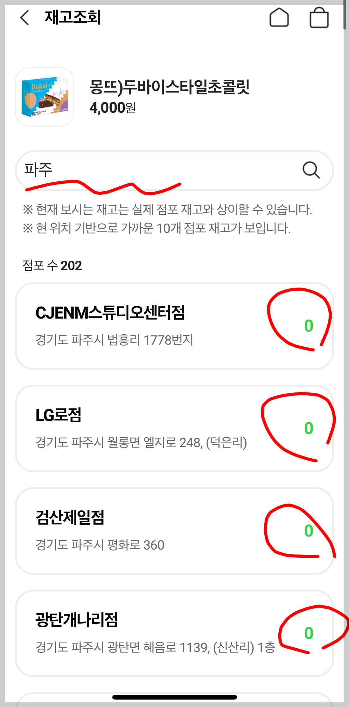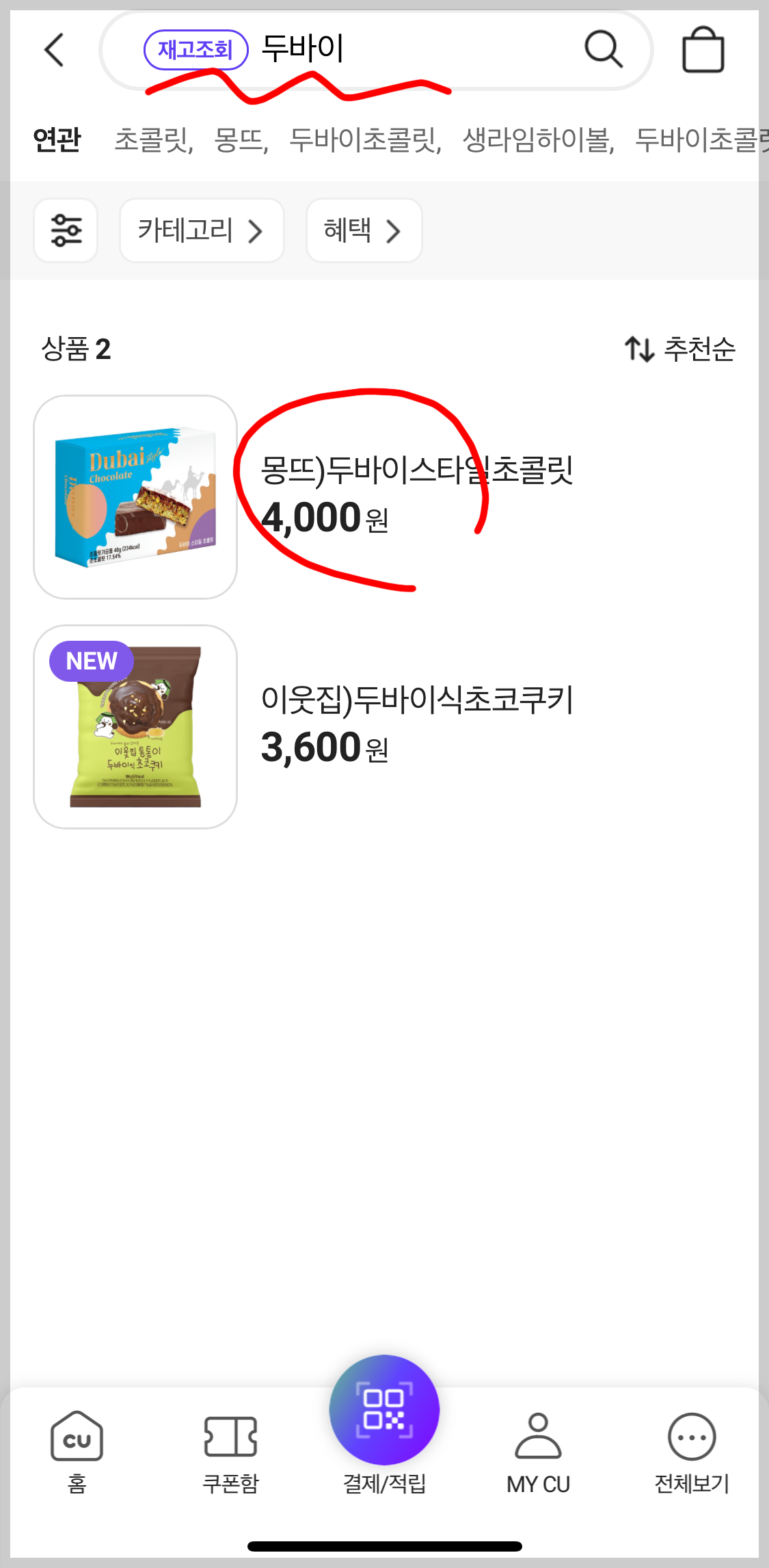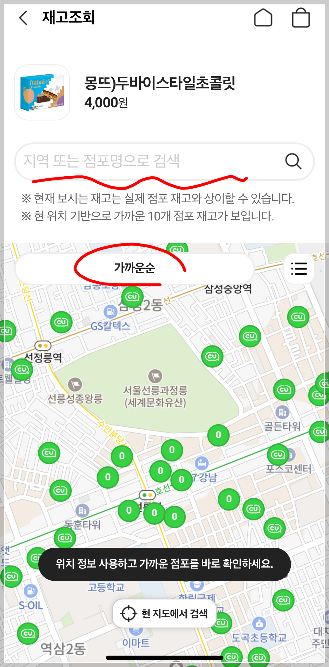 오늘은 내 주변 씨유(CU)편의점에 두바이초콜릿이 있는지 재고확인 하는